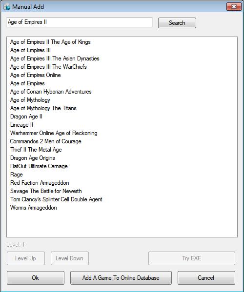 If the name of the game is wrong you can use the search button and box at top to search for other results. If your game is listed click on it and then click OK. If you cant find your game on the online database click 'Add A Game To Online Database' to add it online (Note: anything added to online database will instantly be available from this screen). If you game is